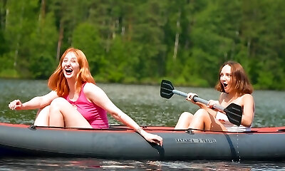трио веселых любвеобильных платиновых блондинки-лесбиянок трахаются втроем на лодке, пока дует ветер