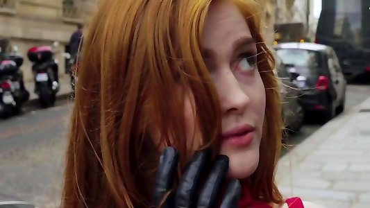 Ultra-kinky sandy-haired in a taut dark-hued latex costume caresses her raw cooch on the floor while shrieking