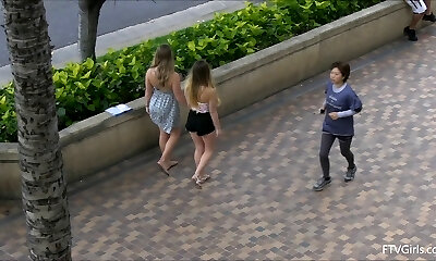 Two sexy gals fondle each others pussies in the street